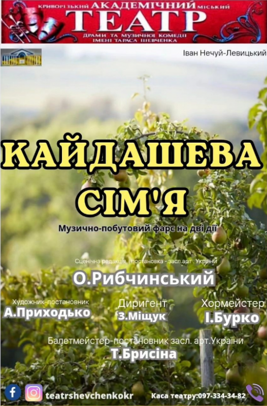 «Кайдашева сім’я» - один із найпопулярніших творів І. Нечуя-Левицького. Сюжет вистави охоплює події, що відбулися у великий сільській родині Кайдашів. Ми зустрічаємося з героями: Кайдашем, його дружиною Марусею та двома їх синами Карпом і Лавріном у переламний момент існування сім'ї, коли дорослішають діти, обирають собі пари і починається інше життя.