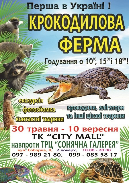 Здесь Вы сможете понаблюдать за самыми древними и самыми опасными хищниками нашей планеты, узнать много интересного об их жизни и охоте. На ферме собраны крокодилы и аллигаторы различных видов со всех уголков земного шара; здесь есть и дети, и солидные особи длиной 3,5 м. Кроме, собственно, крокодилов, представлены еноты, носухи, мартышки, сурикат, змеи, вараны, черепахи и другие интересные животные.