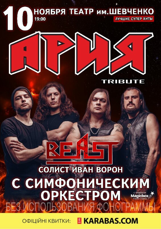 Трибьют-бенд BEAST – проект, признанный не только фанатами рока, но и самими участниками группы АРИЯ. BEAST – первый и единственный трибьют-бенд на просторах СНГ, которому удается максимально точно передавать всю мощь живых выступлений Арии. Мощи, объёма и красоты исполняемой музыке придаст эстрадно-симфонический оркестр под управлением Игоря Знатокова.