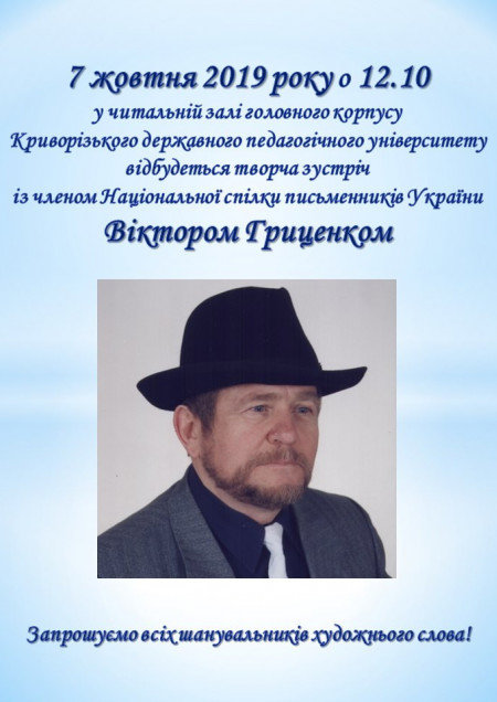 Поклонников художественного слова приглашаем на творческую встречу с членом Национального союза писателей Украины Виктором Гриценко.