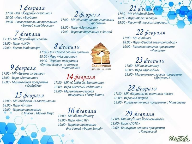 Наша детская комната Скворечник предлагает провести зиму вместе. Мы проводим интересные игры и мастер-классы. С нетерпением ждем наших маленьких друзей!