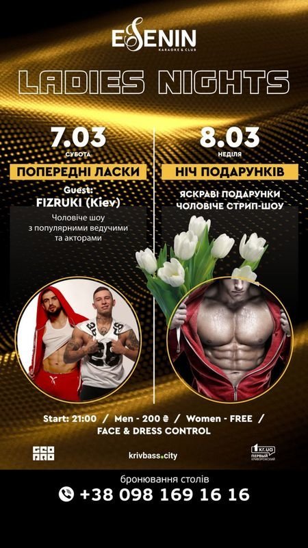 В эту ночь все для тебя. В дополнение к безумным танцам, незабываемой атмосфере, пьянящим коктейлям мы подготовили для тебя рецепт идеального 8 марта: яркие подарки, незабываемое мужское стриптиз-шоу.