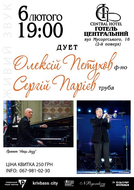 Внимание всех ценителей качественной музыки! Впервые на сцене вместе два больших музыканты современности. Алексей Петухов (Одесса) - пианист, композитор, аранжировщик, арт-директор одесского джазового фестиваля и Сергей париев (Полтава), музыкант, педагог, участник всех "Горизонтов джаза" в составе ансамль А. Гебель вместе выступают на одной сцене! В программе известные и любимые произведения джазового и блюзового направления, а также авторская музыка. Не пропустите такое событие!
