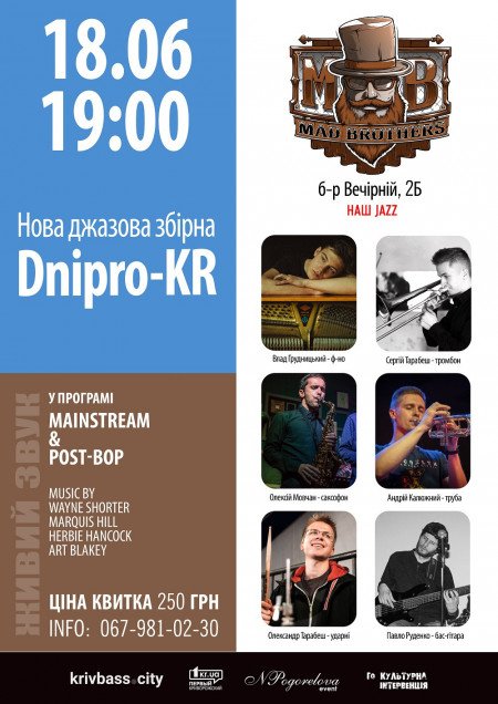 Новая джазовая сборная команда Днепр-Кривой Рог сыграет концерт из произведений джазового мейнстрима и пост-бопа. В программе произведения гербе Хэнкока, Арта Блейк, Уэйна Шортера, Маркиза Хилла и инших. Неповторимое звучание мидной группы и замечательной ритм-секции.
