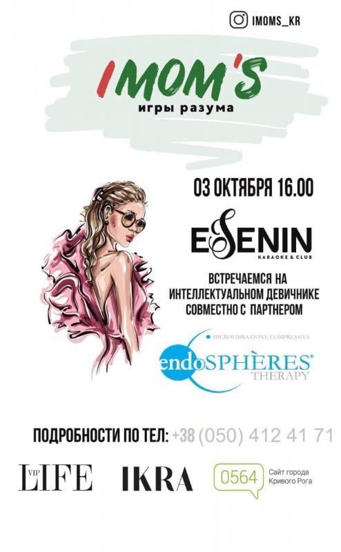 3 октября - состоятся “ИГРЫ РАЗУМА IMOM’S” для всех представительниц прекрасного пола возрастом старше 18 лет в Esenin karaoke сбор гостей в 15.00, начало игры в 16.00. Будет празднично, танцевально, интересно и интеллектуально!