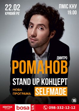 Дмитрий Романов – виртуоз комедийного жанра и популярный Stand Up комик. В честь своего 20-летия на сцене Дмитрий подготовил совершенно новую программу. Интеллектуальный юмор, неповторимая импровизация с залом, острые шутки – минимум того, что ожидает зрителей.
