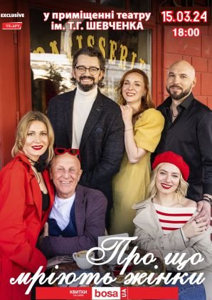Шановні глядачі, нажаль вистава “Про що мріють жінки” який мав відбутися 17.10.23 перенесено на 15 березня 2024р. Усі квитки придбані раніше залишаються дійсними на нову дату і не потребують обміну. Вибачте за незручності.