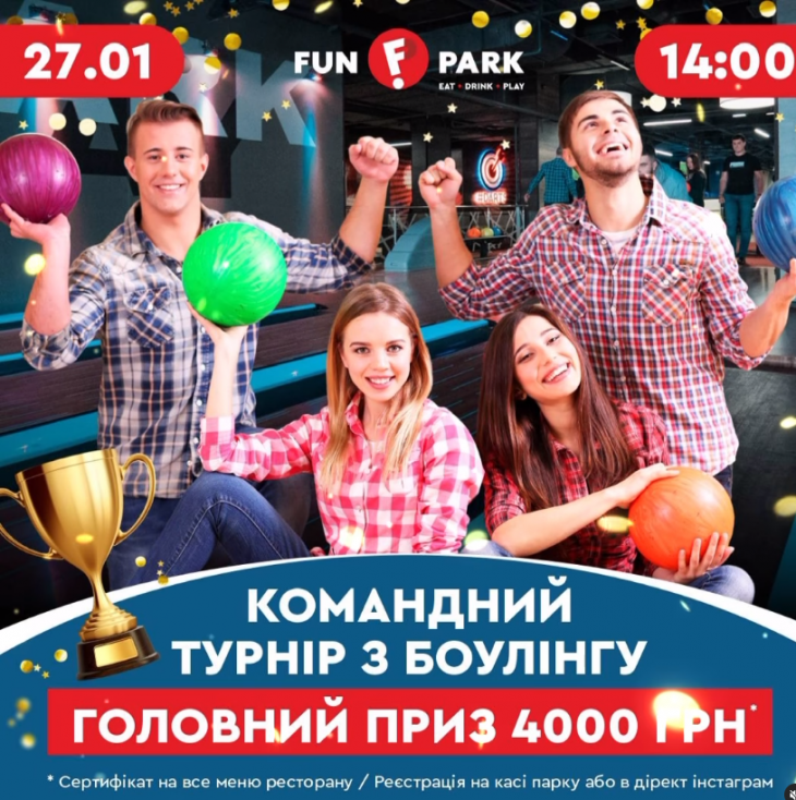 Аматорський турнір з боулінгу для усіх охочих. Призовий фонд — депозит 4 000 грн на меню у Fun Park.
