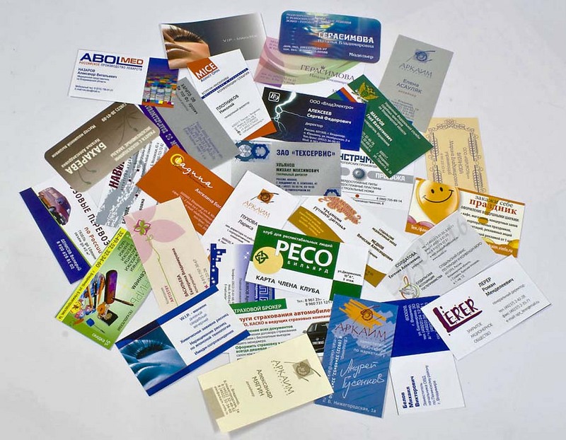 - Визитки. Изготовлены из картона или плотной бумаги листки, с краткой информацией о фирме, услугах, человеке. Стандартный размер 50*90;