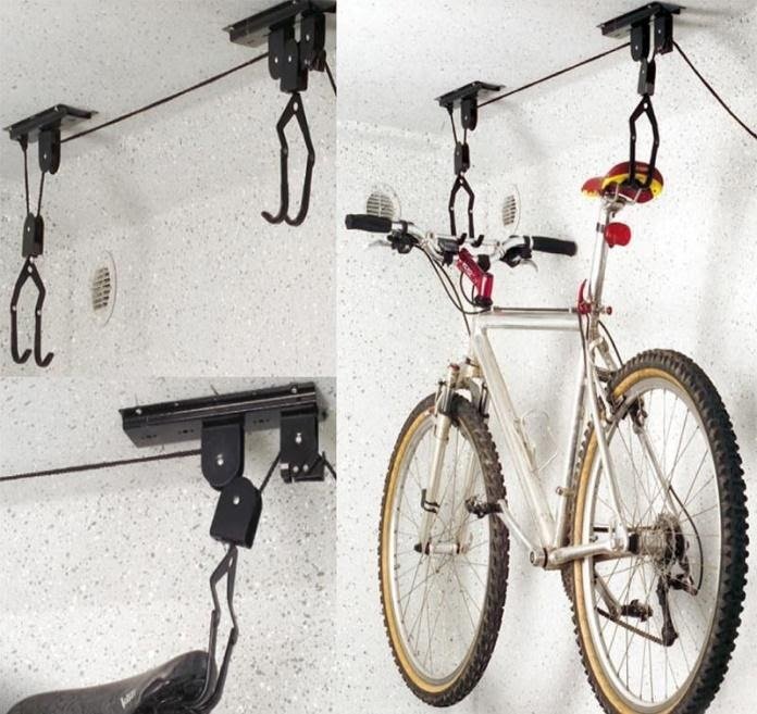 Такое крепление довольно просто решает проблему свободного пространства, так как велосипед поднимается к потолку. Само крепление прикрепляется дюбелями, а велосипед поднимают и опускают с помощью веревки.