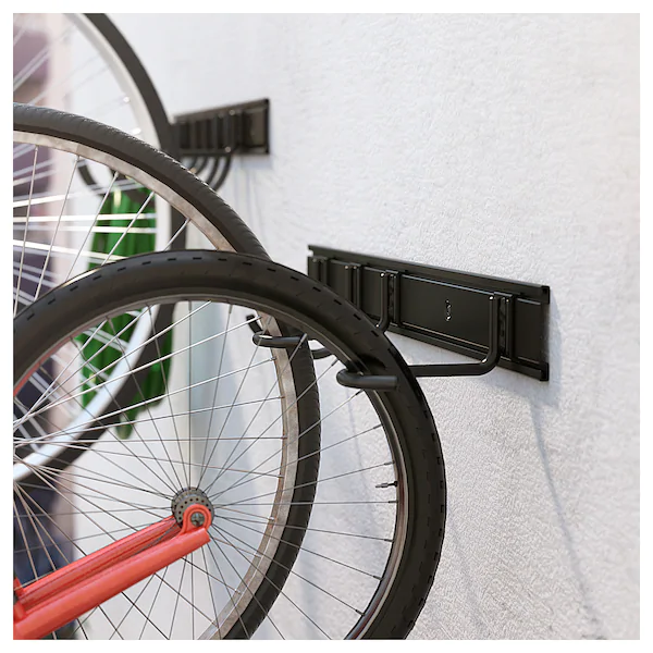 Кронштейн имеет вид двойного крюка с покрытием из мягкой резины. Он закрепляется на стене. Велосипед на него устанавливают верхней трубой рамы. При таком решении нет нагрузки на обод и спицы велосипеда. В некоторых случаях можно закрепить 2 велосипеда вдоль стены, при этом потеря полезного пространства минимальна. Также такое решение очень удобно, так как велосипед легко снимать с крепления.