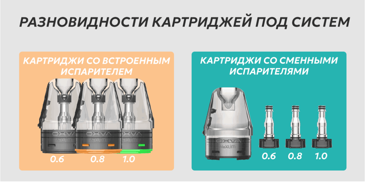 Картриджи отличаются конструкцией и типом испарителя. Например, картриджи Vaporesso для самых популярных моделей бренда выпускаются со встроенными испарителями. А Geekvape часто создает для своих под модов уникальные картриджи под сменные испарители. Рассмотрим подробнее достоинства и недостатки каждого типа.