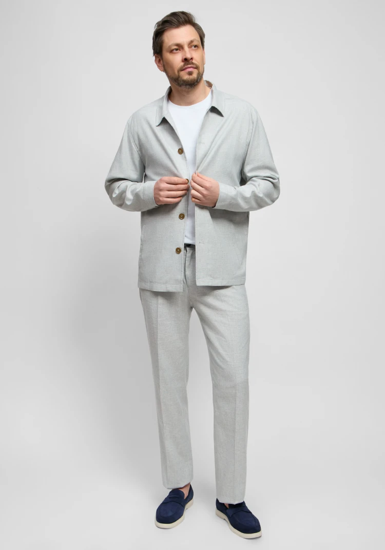Цей варіант формує більш зібраний образ, не втрачаючи водночас літньої легкості. Піджак тут має структуровану лінію плечей, але не виглядає перевантаженим. Штани тримають форму, залишаючись комфортними навіть у спеку. Такий формат доречний у міському середовищі, де важливо виглядати впевнено, але без зайвої формальності. Він легко інтегрується в робочий ритм, дозволяючи виглядати доречно як на зустрічах, так і під час неформального спілкування.