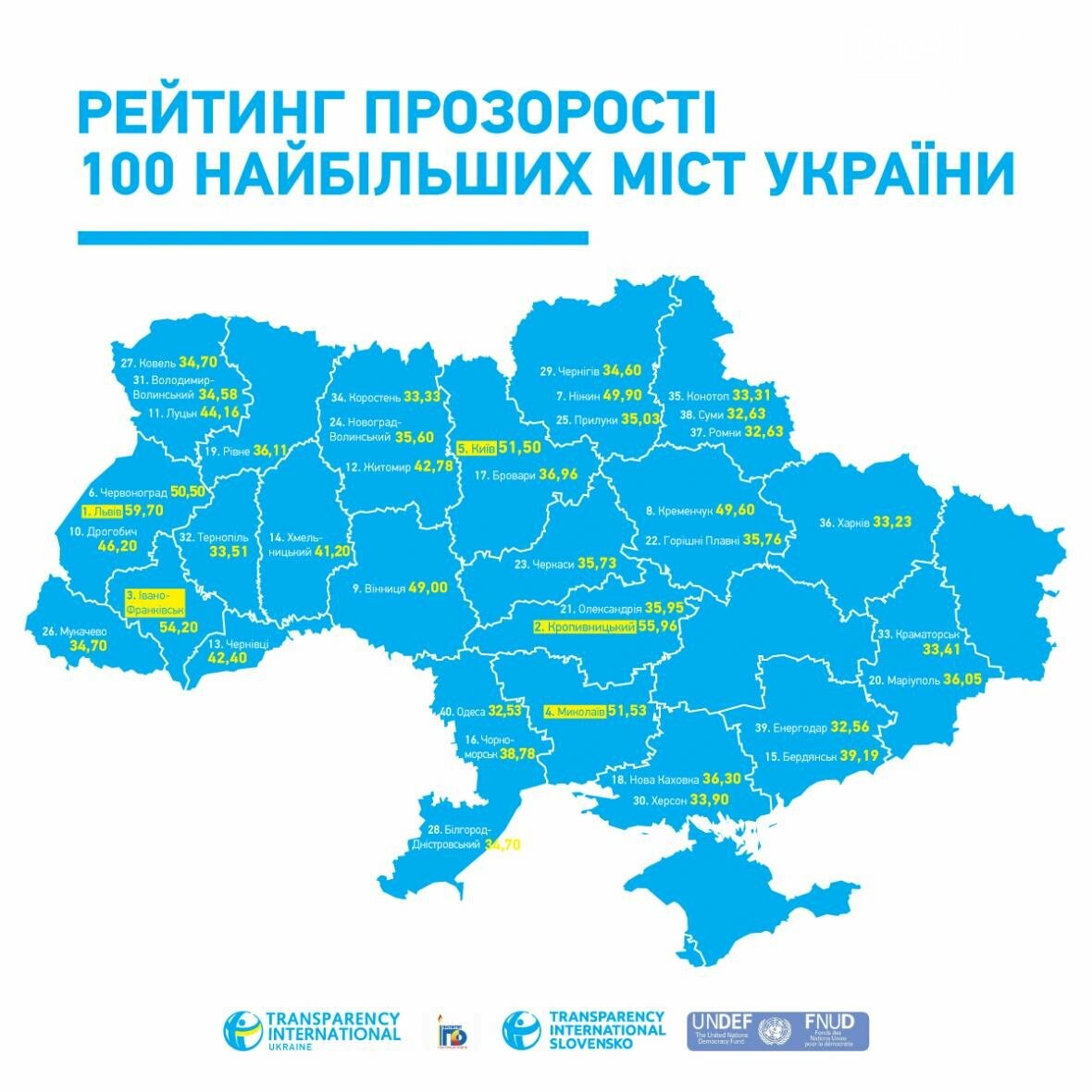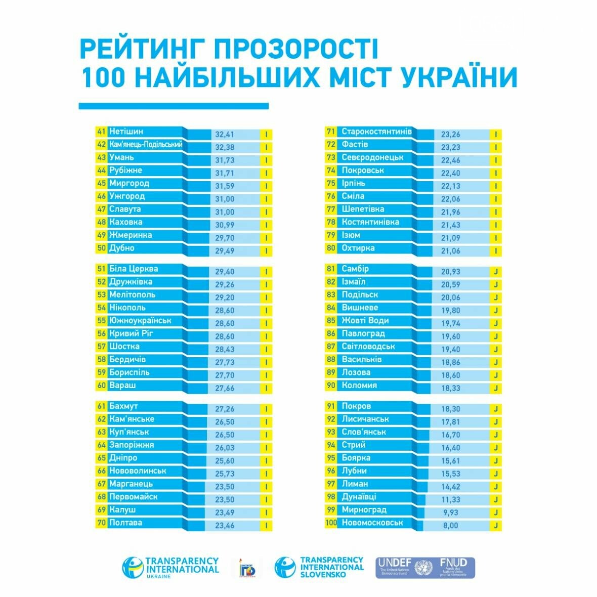 В рейтинге прозрачности 100 городов Украины наибольшее количество баллов получили Львов (57 из 100), Кропивницкий (56), Ивано-Франковск (54), Киев (52) и Николаев (51,5). Наименьшее количество баллов получили Новомосковск (8), Мирноград (10), Дунаевцы (11). Кривой Рог с 28, 60 баллами в указанном рейтинге на 56-м месте.