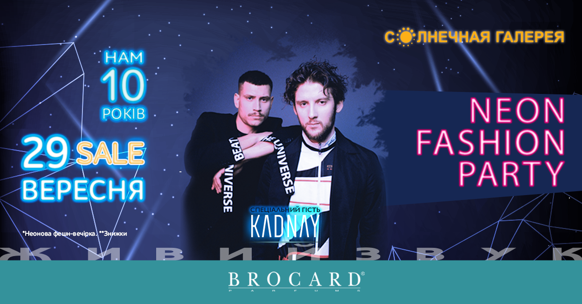 29 сентября ТРК «Солнечная Галерея» отпразднует 10 лет вместе со всеми криворожанами и гостями, которые специально приедут в Кривой Рог из столицы и других городов Украины. На праздничном Дне рождении в стиле Neon fashion party все будет в неоновом цвете – неоновые очки, неоновые браслеты, неоновая фотозона и неоновое шоу.