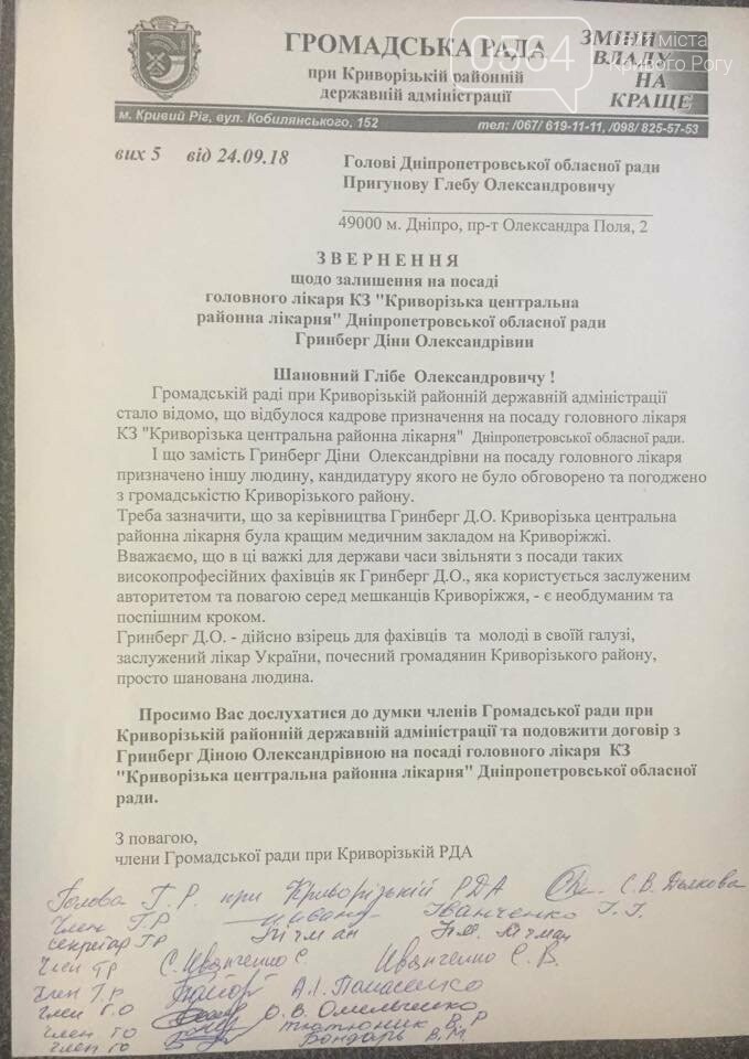 Депутаты Криворожского райсовета призвали председателя Днепропетровского областноного совета Глеба Прыгунова вернуть Дину Гринберг на должность главврача районной больницы. Соответствующее обращение было принято на внеочередной сессии районного совета 25 сентября.