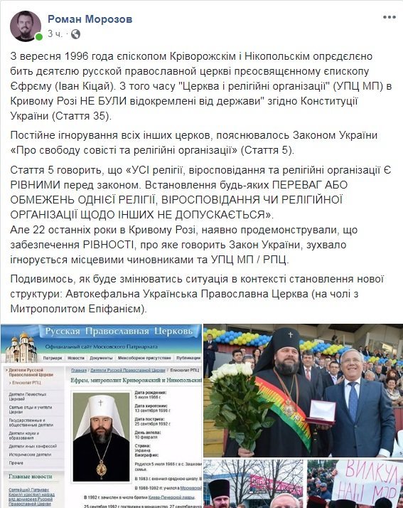 "Но 22 последних года в Кривом Роге, наглядно продемонстрировали, что обеспечение равенства, о котором говорит Закон Украины, вызывающе игнорируется местными чиновниками и УПЦ МП / РПЦ", - отметил Морозов и добавил: