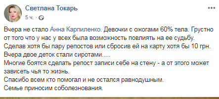 "Вчера (13 марта) не стало Анны Карпиленко. Девочки с ожогами 60% тела. Грустно от того, что у нас у всех была возможность повлиять на ее судьбу. Сделав хотя бы пару репостов или сбросив ей на карту хотя бы 10 грн. Вчера двое деток стали сиротами..... Спасибо всем кто помогал и не остался равнодушным. Семье приносим соболезнования".