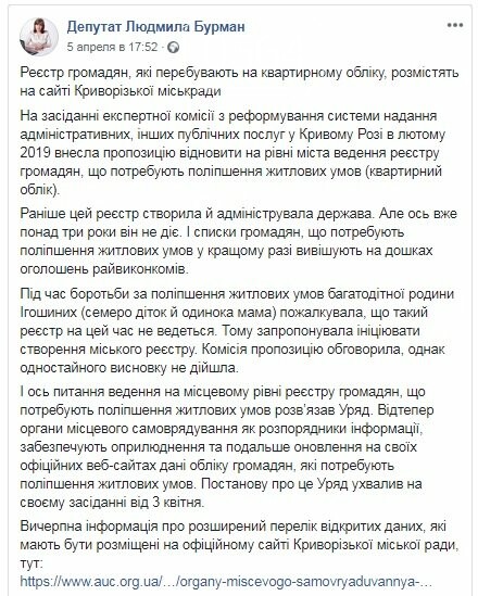 Об этом сообщила депутат Криворожского горсовета Людмила Бурман в Facebook.