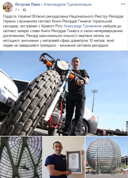 "Гордость Украины! Поздравляем рекордсмена Национального Реестра Рекордов Украины с признанием мировой Книги Рекордов Гиннеса! Украинский каскадер, экстремал из Кривого Рога Александр Турчанинов вошел в мировую галерею славы Книги Рекордов Гиннеса со своим непревзойденным достижением. Рекорд максимального количества мертвых петель на мотоцикле, выполненных в металлической сфере диаметром 10 метров, который едва не завершился трагедией - признан мировым рекордом", - отметила Лана Ветрова.