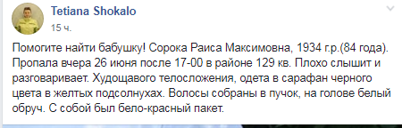 "Помогите найти бабушку! Сорока Раиса Максимовна, 1934 г.р.(84 года). Пропала вчера, 26 июня, после 17-00 в районе 129 квартала", - отметила девушка.