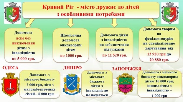 «Хотілось би зазначити, що департамент соціальної політики постійно аналізує та порівнює досвід інших міст України. Так, в Одесі при бюджеті в 11 млрд. грн., в півтори рази більшому ніж у Кривому Розі, діти з інвалідністю з міського бюджету отримують одноразову допомогу у розмірі 2 тис. грн., і лише діти з малозабезпечених сімей отримують 6 тис. грн., у Запоріжжі допомога онкохворим дітям становить 10 тис. грн, іншим хворим дітям - одна тисяча гривень, у місті Дніпро такі виплати взагалі не передбачені»,- зазначила І.Благун.