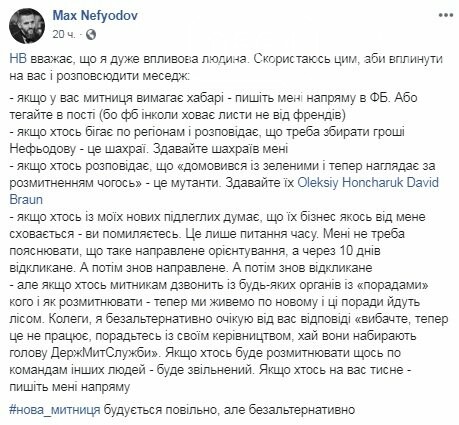 "Если у вас таможня требует взятки - пишите мне напрямую в ФБ", - Максим Нефедов обратился к украинцам