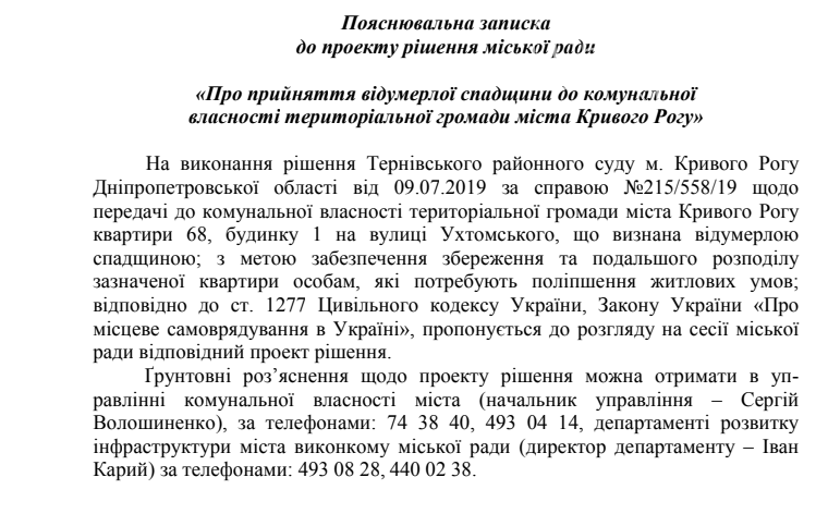 Решением Терновского райсуда от 09.07.2019 в коммунальную собственность территориальной общины города Кривого Рога передается квартира 68 в доме №1 по улице Ухтомского, которая признана выморочным наследием.
