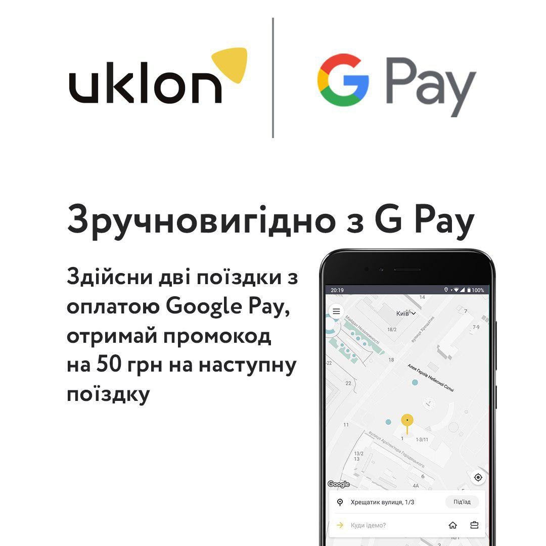 С 7 октября до 7 ноября райдеры сервиса Uklon получат промокод на поездку номиналом 50 грн, совершив две успешные поездки, оплаченных с помощью Google Pay.