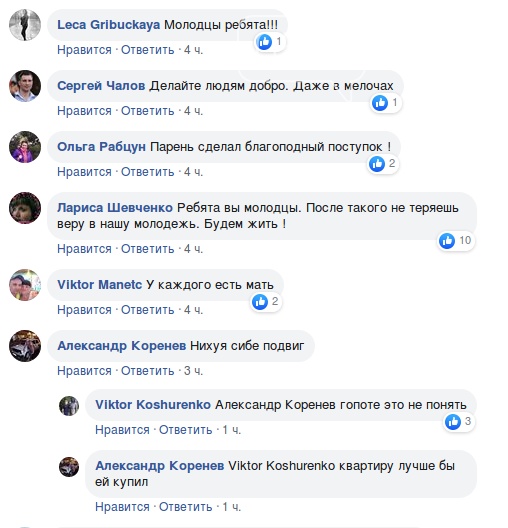 Случайно слышу разговор: приехала с села уладить дела, ждёт маршрутку. Достала хлеб и конфеты "Джек", спрашивает у администратора можно ли взять кипятка. Один из парней молча встаёт и идёт покупать чай. Ребята, respect!