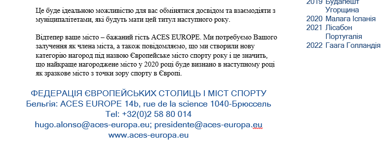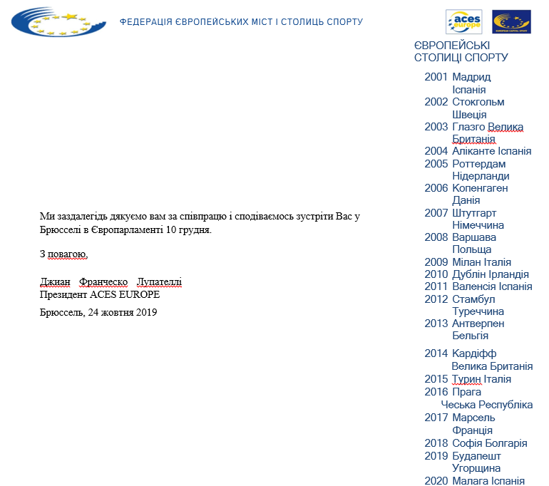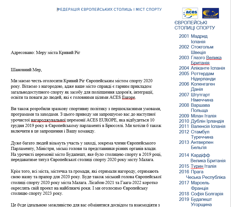 У листі до міського голови Юрія Вілкула йдеться: «Ми маємо честь оголосити Кривий Ріг Європейським містом спорту 2020 року. Вітаємо з нагородою, адже місто справді є гарним прикладом загальнодоступного спорту як засобу для поліпшення здоровя, інтеграції, освіти та поваги до людей, які є головними цілями ACES Europe. Ви також розробили зразкову спортивну політику з першокласними умовами, програмами та заходами».