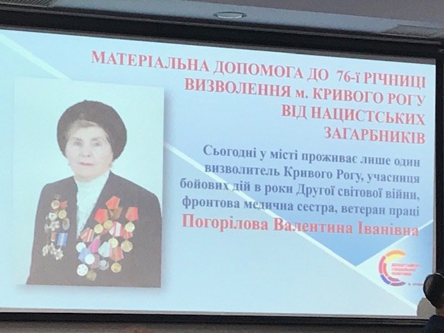 Місто турбується про ветеранів і щороку до Дня визволення Кривого Рогу з міського бюджету надається матеріальна допомога визволителям. «На превеликий жаль йдуть з життя наші захисники. Сьогодні у місті лише один визволитель, учасниця бойових дій в роки Другої світової війни, фронтова медична сестра, ветеран праці Валентина Іванівна Погорілова», - сказала І. Благун.
