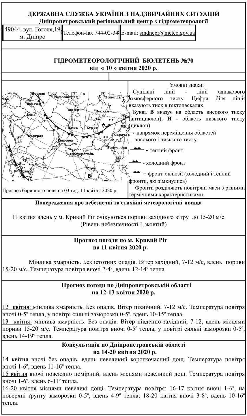 Днепропетровским региональным центром по гидрометеорологии на 11 апреля 2020 объявлено предупреждение о том, что местами по области ожидаются порывы западного ветра 15-20 м / с. (Уровень опасности I, желтый), ночью и утром по всей Днепропетровской области ожидаются заморозки на поверхности почвы 0-5 градусов (уровень опасности I, желтый).