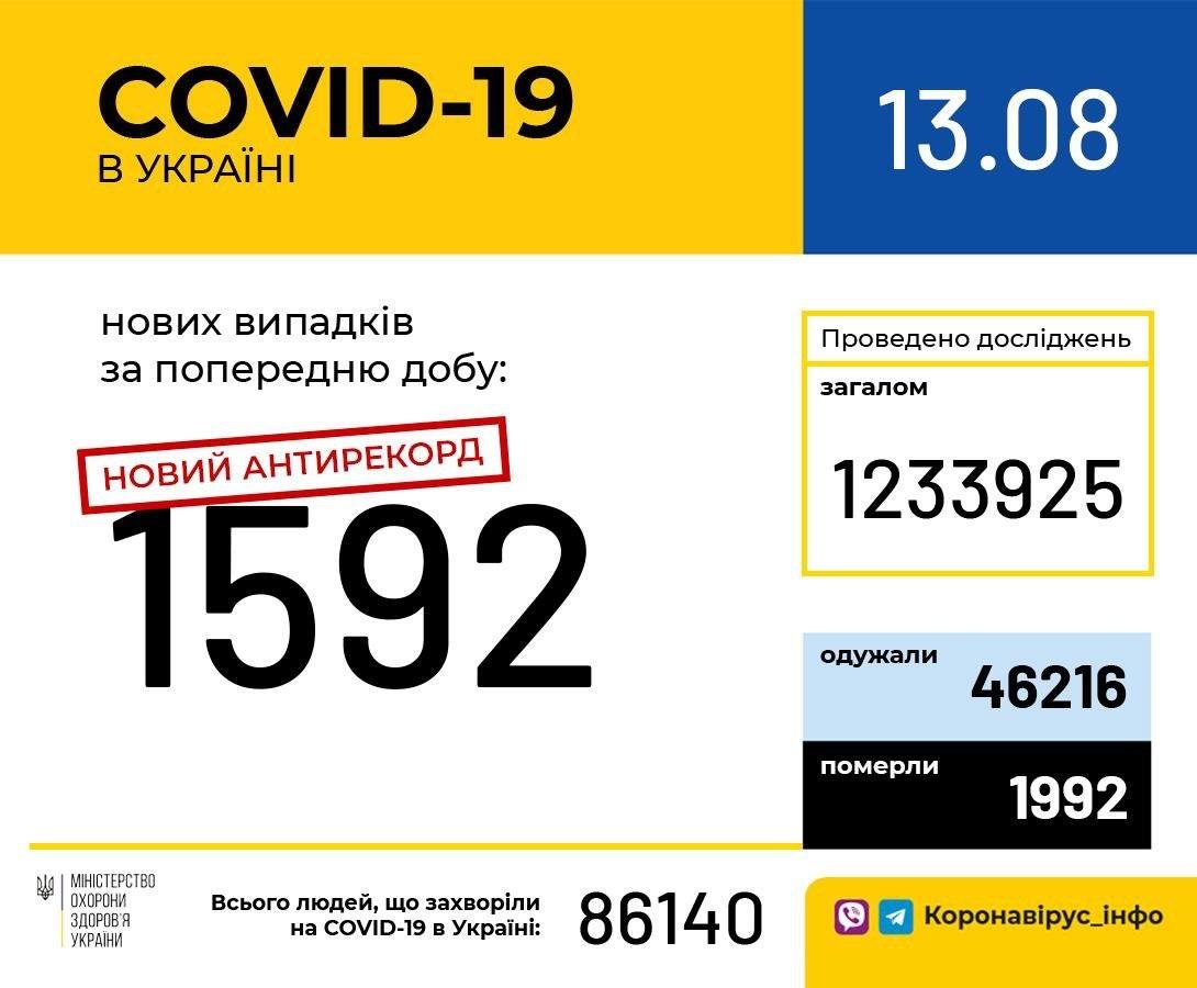 Как сообщает пресс-служба Минздрава, по состоянию на 9:00 13 августа в Украине 86140 лабораторно подтвержденных случаев COVID-19, из них 1992 летальные, 46216 пациентов выздоровели. За сутки зафиксировано 1592 новых случая.