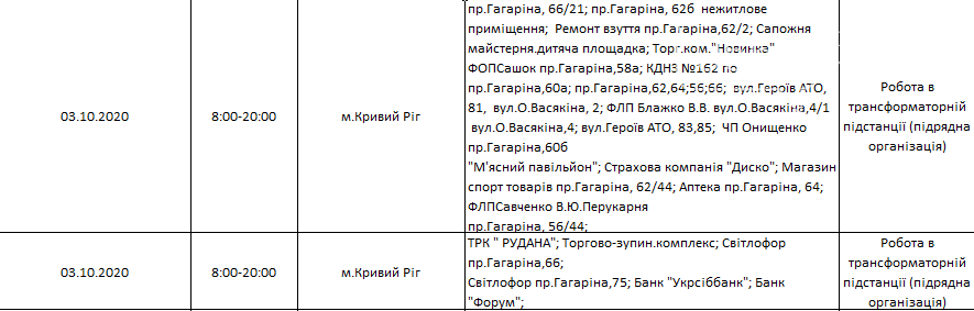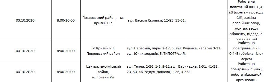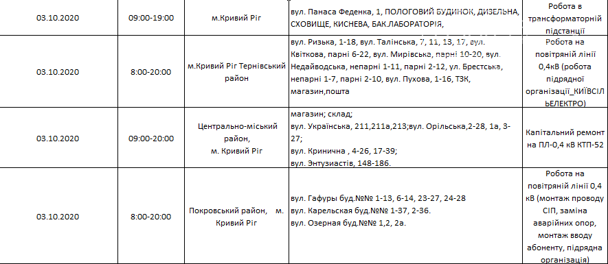 Согласно актуальной информации пресс-службы компании ДТЕК “Дніпровські електромережі”, свет будет отключен преимущественно в таких районах: