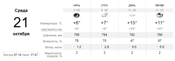 Температура днем +21 С, ночью +12 С. Ветер юго-западный, до 3.1 м/с. Влажность на уровне 48-50% днем и 90-92% ночью.