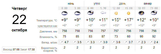 Утром будет сплошная облачность, но к обеду погода наладится и появится солнце. Ветер: юго-западный, с порывами до 3.7 м / с. Максимальная температура воздуха ночью будет +7 С, а днем +17 С. Влажность — выше нормы, 60-73%, а под ночь максимально высокая — 100%.