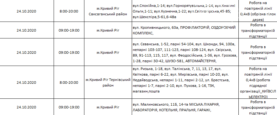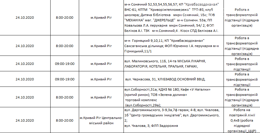 Согласно актуальной информации пресс-службы компании ДТЕК “Дніпровські електромережі”, свет будет отключен в таких районах, как: