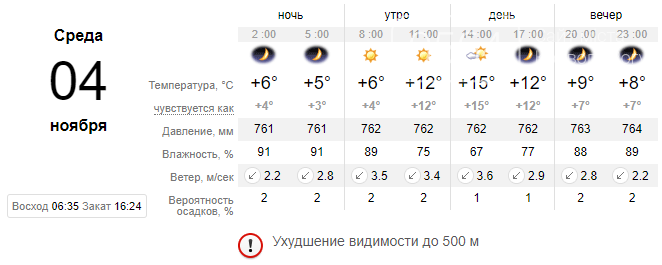 Малозначительная облачность во второй половине дня. Ночью и утром туман. Ветер северо-восточный, с порывами до 3.6 м/с днем и до 2.8 м/с вечером.