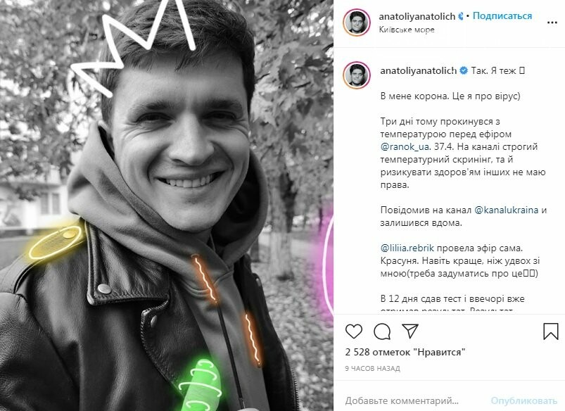 "У меня корона. Это я о вирусе) Три дня назад проснулся с температурой перед эфиром @ranok_ua. 37.4. На канале строгий температурный скрининг, и рисковать здоровьем других не имею права. Сообщил на канал @kanalukraina и остался дома. @ Liliia.rebrik провела эфир сама. Красавица. Даже лучше, чем вдвоем со мной (надо задуматься об этом)