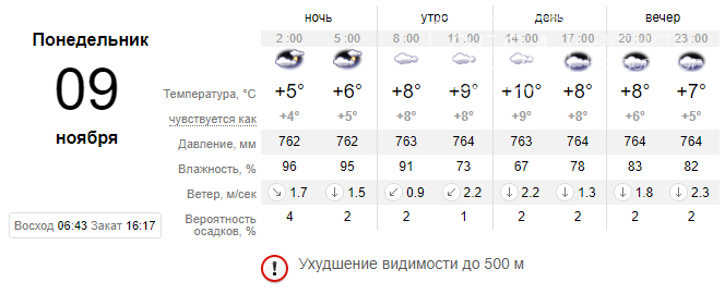 Завтра, в понедельник, по прогнозам плотный туман — с ухудшением видимости до 500 м. Со среды ожидается спад температуры до 0 С. Также, возможны порывы усиленного ветра. А с субботы — температура от -2 С.