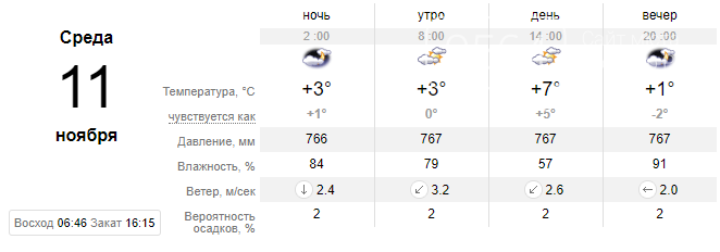 Ветер — северный, с порывами до 3.4 м/с. Максимальная температура днем +8 С, ночью +3 С.