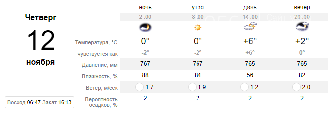 Ветер — восточный, спокойный, с порывами до 1.2 м/с днем. Ночью чуть усилится. Максимальная температура днем +6 С, ночью +1 С.