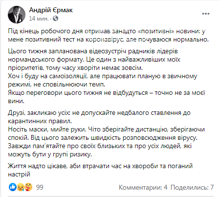 "Это один из важнейших моих приоритетов, поэтому времени болеть нет совсем. Хотя и буду на самоизоляции, но работать планирую в обычном режиме, не замедляя темп. Если переговоры на этой неделе не состоятся - точно не по моей вине. Друзья, призываю всех: не допускайте небрежного отношения к карантинным правилам. Носите маски, мойте руки. Храните дистанцию, сохраняя спокойствие. От этого зависит скорость распространения вируса. Всегда помните о своих близких и о всех людей, которые могут быть в группе риска. Жизнь слишком интересная, чтобы терять время на болезни и плохое настроение", - отметил Андрей Ермак.