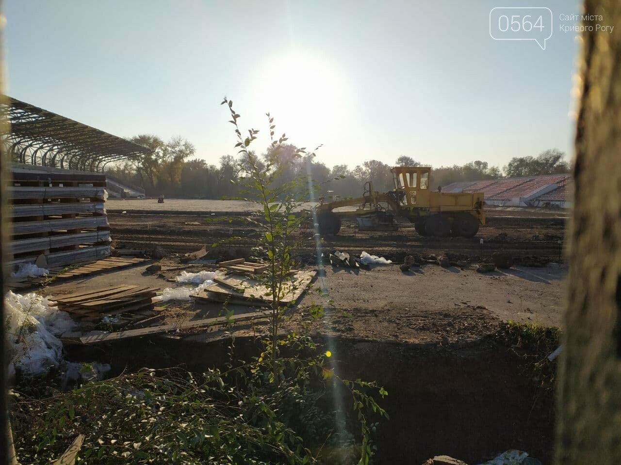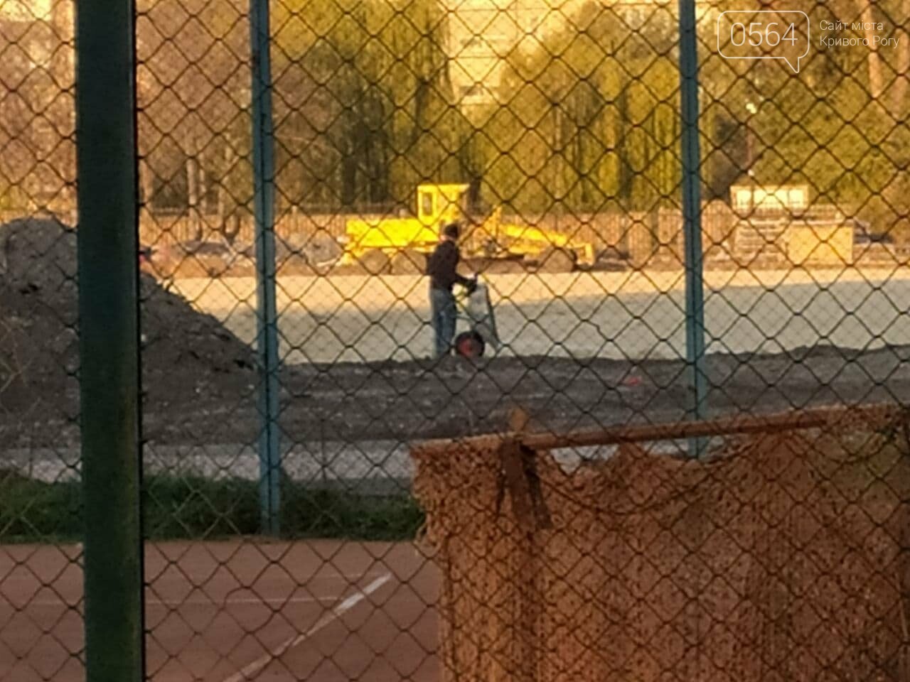 Несмотря на выходной, на стадионе "Спартак" работает бригада строителей - уплотняют поле под будущий газон и возят песок на ручной тачке.