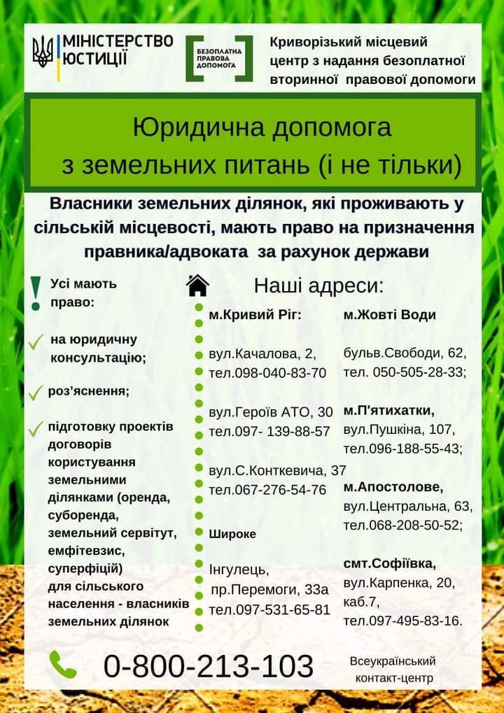 Телефон для получения бесплатной правовой помощи для жителей сел Лозоватской, Новопольской и Глееватской громад Криворожского района -