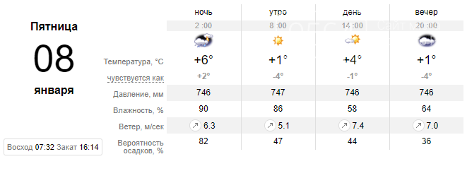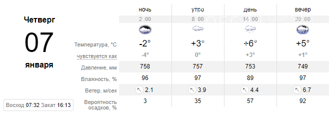 В этот день ветер снизится в порывах и сменит направление на восточный. Температура упадет еще ниже - до -6 С. На небе будет наблюдаться минимальное солнечное прояснение, но недолго. Осадков не предвидится.