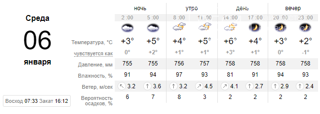 Ветер южного/юго-западного направлений, с порывами до 5-6 м/с. Температура в течение дня "плюсовая" - от +1 С до +6 С. Ночь не будет сильно холодной - на уровне 1-4 С с плюсом. Осадков не предвидится, погодные условия будут оставаться стабильными.