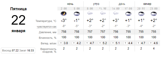 Сплошная облачность целый день. Без существенных осадков. Обещают туман. На дорогах гололедица. Ветер южный по большей части, с порывами до 6-7 м/с. Местами, скорость будет достигать 12 м/с. Температура в течение дня от -1 С до +3 С.