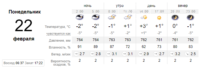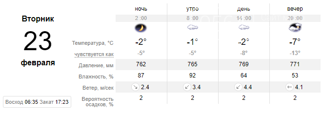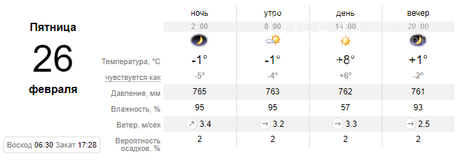 В этот день ожидается приятная погода, да еще и с потеплением днем до +8 °С. Ветер в течение дня снова западного направления, с порывами до 4 м/с. День без осадков.